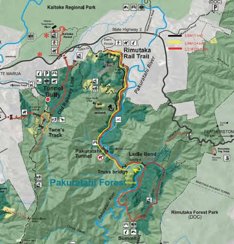 This is a fun run & walk on the Remutaka Rail Trail through the Remutaka Ranges. We start at 254m above sea level and cruise up a shallow gradient (<1 in 40) all the way to the turn around near the summit. This is a scenic and historic route that is a jewel in the Wellington region. The steep, bush clad valley, the river below, tunnels, bridges and plenty of sweaty people make for a great morning out. This course can easily be negotiated by any modestly fit person. All distances are predominantly on hard packed gravel track. Water is supplied throughout the course and there will also be a coffee cart near the Kart Club clubroom.